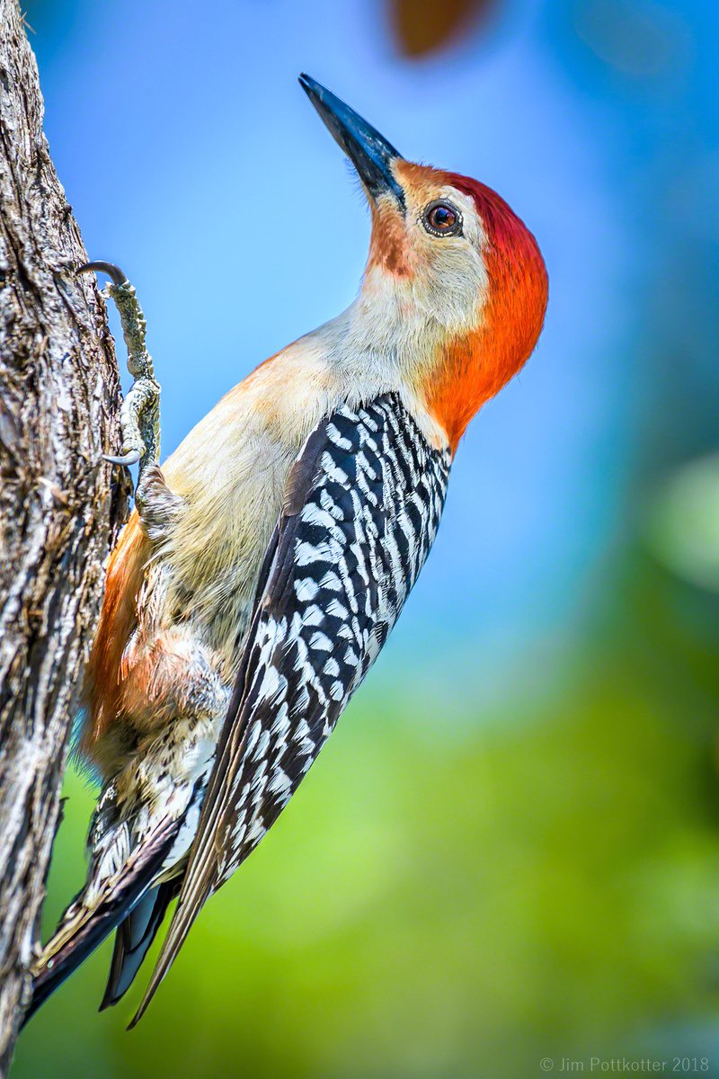 Sometimes the Red-bellied Woodpecker works his way up the tree, and sometimes he works his way down. I was sitting nearby looking for birds when he landed high. I just watched and waited as he circled his way down near eye level.