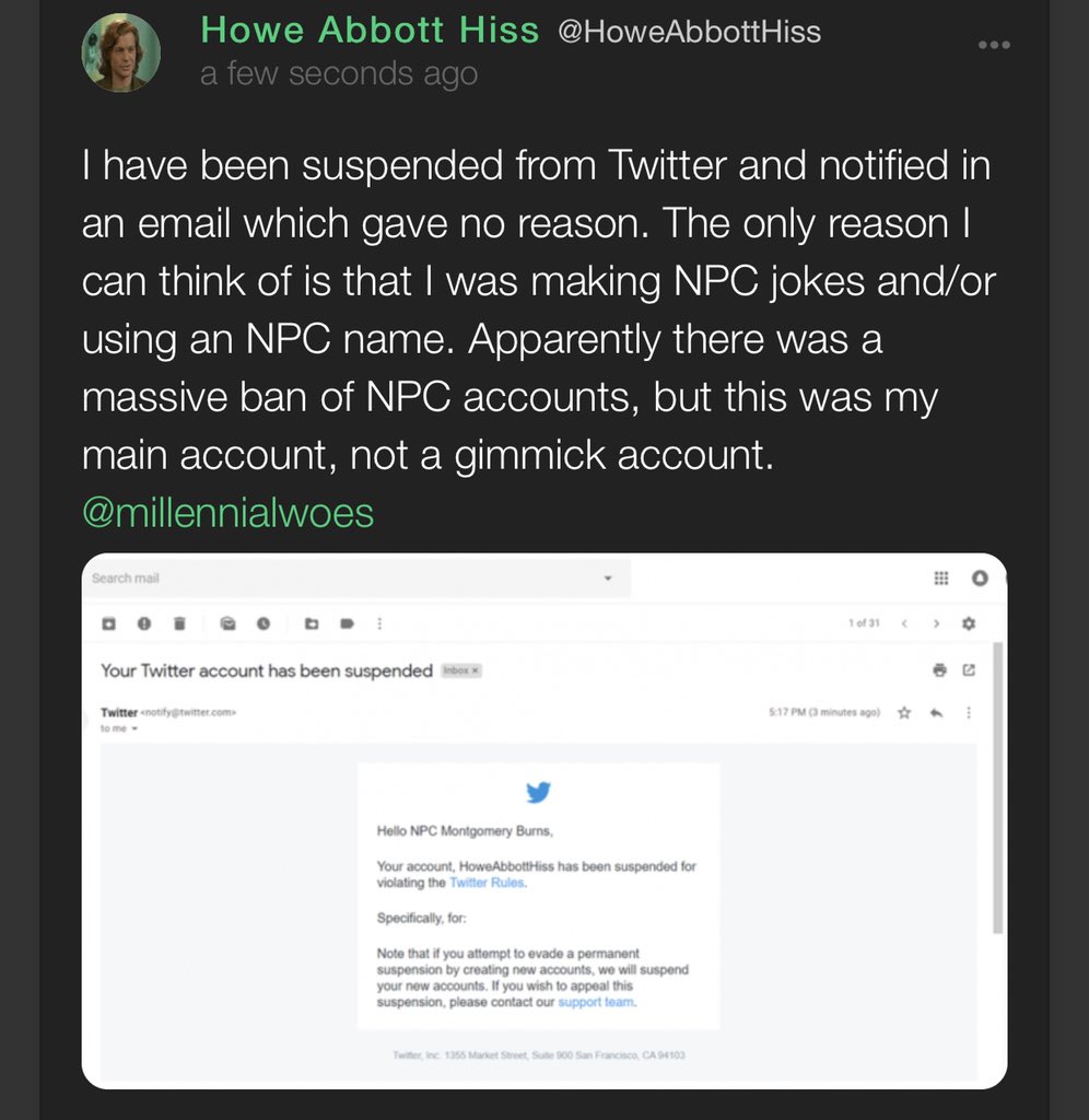 Multiple reports coming in of NPC Twitter bans. NPC lives matter!pic.twitter.com/QHLNI1cnLs