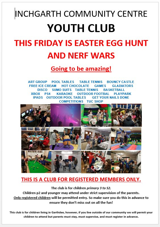 Easter Egg hunt, Nerf wars, amazing facilities, loads of fun...tomorrow at Inchgarth youth club. 5pm-7pm, FREE and for registered members only.pic.twitter.com/M5elxi4Hxf