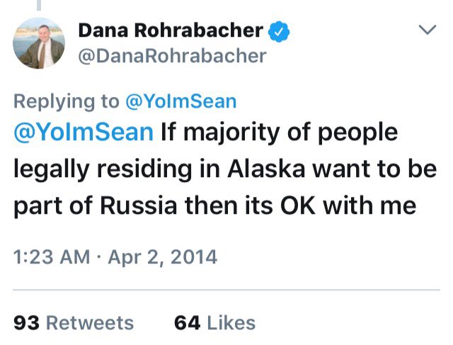 Dana Rohrbacher thinks it would be cool to give Alaska back to Russia. No, I’m not kidding or even exaggerating. He’s got to go. DONATE to @HarleyRouda #BlueWave2018https://twitter.com/natcookresists/status/947170141690671104 …