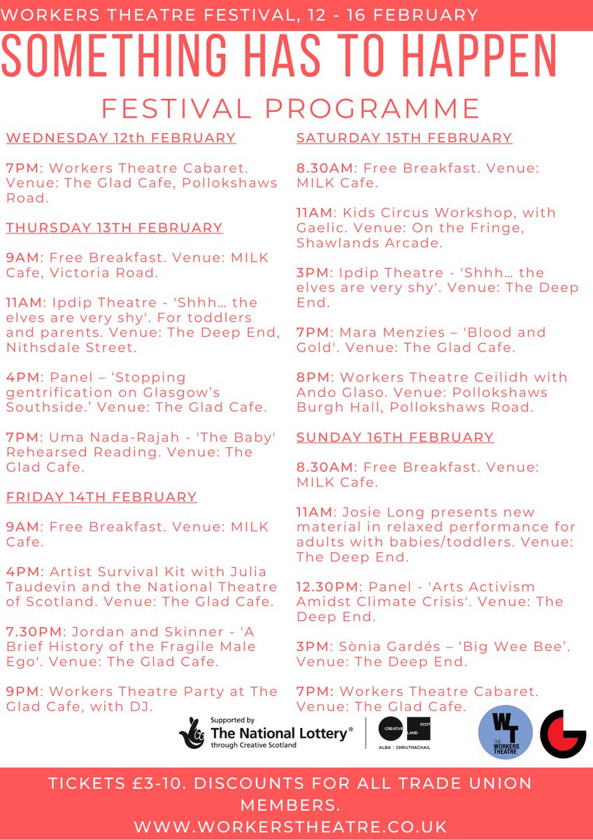 #SomethingHasToHappen We are delighted to have put together an exciting array of performances, workshops, cabaret and MUCH MORE from the 12th to 16th of February. Tickets on sale now - get it in your diaries and tell your friends! Full prog & tickets: https://workerstheatre.wordpress.com/something-has-to-happen/ …pic.twitter.com/KaSef3UIBW