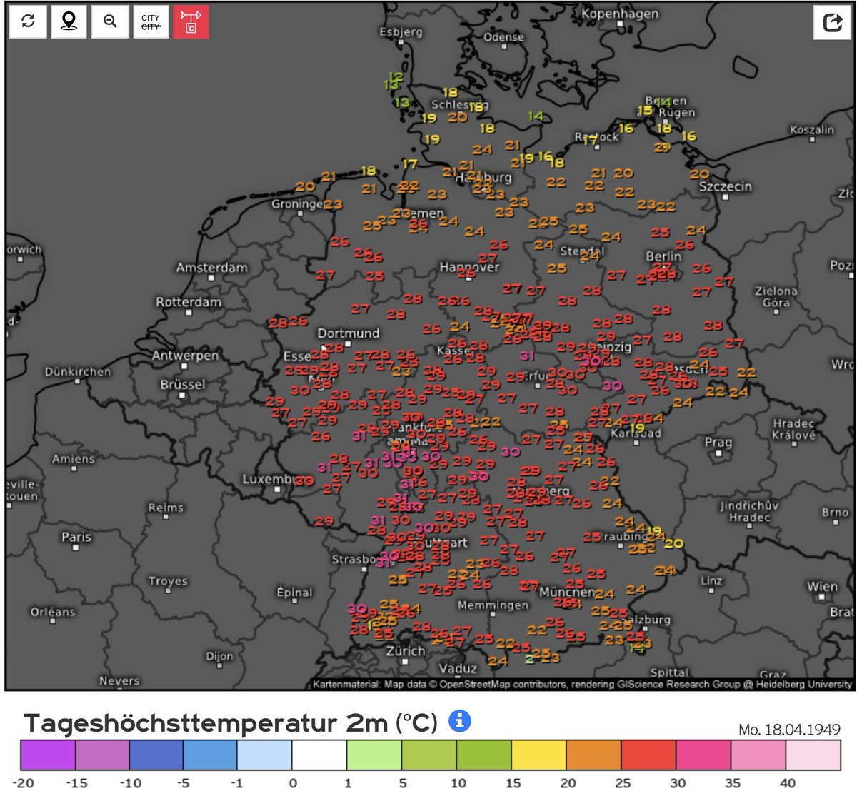 18th April Paris registered their hottest April maximum on record on this day in 1949. It was +30.2°C. Paris has only ever recorded +30C in April on two occasions and both came within 2 days of each other in 1949. It was +30C in many areas across SW Germany too. https://twitter.com/Harry_Hardrada/status/1383031951695736834 …pic.twitter.com/idme8g3eMN
