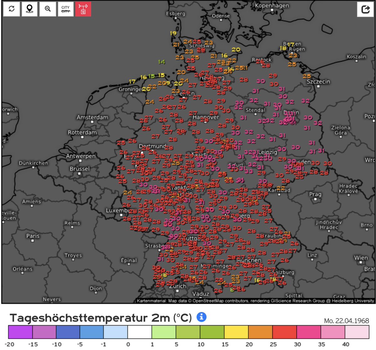 21st-23rd April, 1968 It’s the wild spring of 1968 again and just after mid-April a torrid +30C heatwave crossed over Germany for three days. Record April heat as well as the earliest +30C temperatures were broken in many towns/cities across West and East Germany.pic.twitter.com/UVzoHx7645