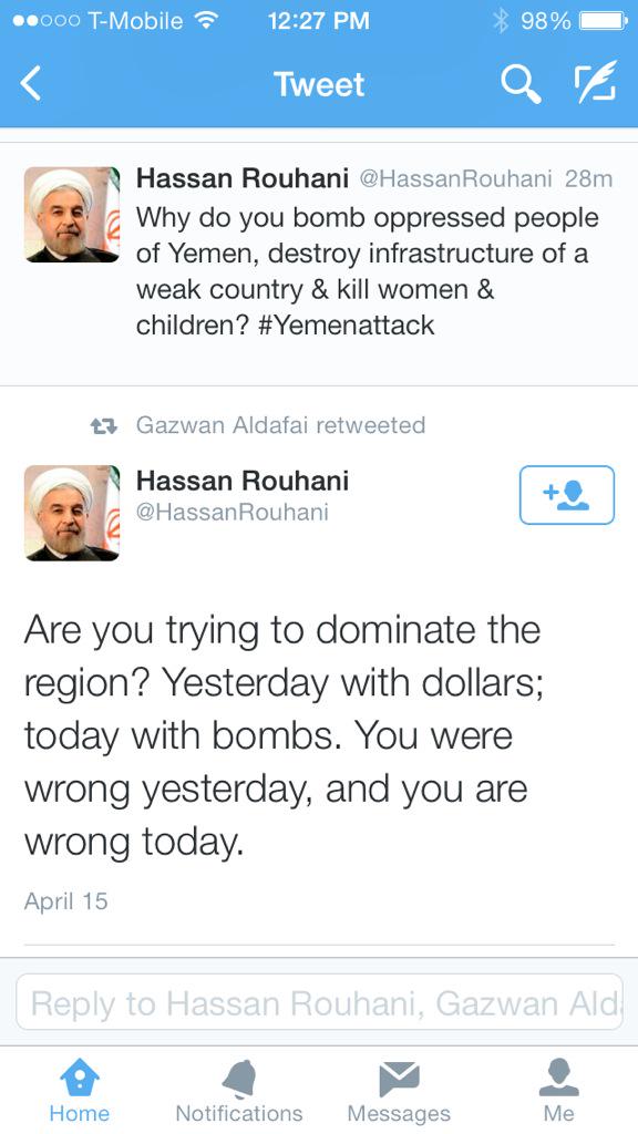 @rmltpie@HassanRouhani yeh true that's why it's killing Syrians and defending#Assad and interfering#Bahrain and#Yemen - 1 more reply