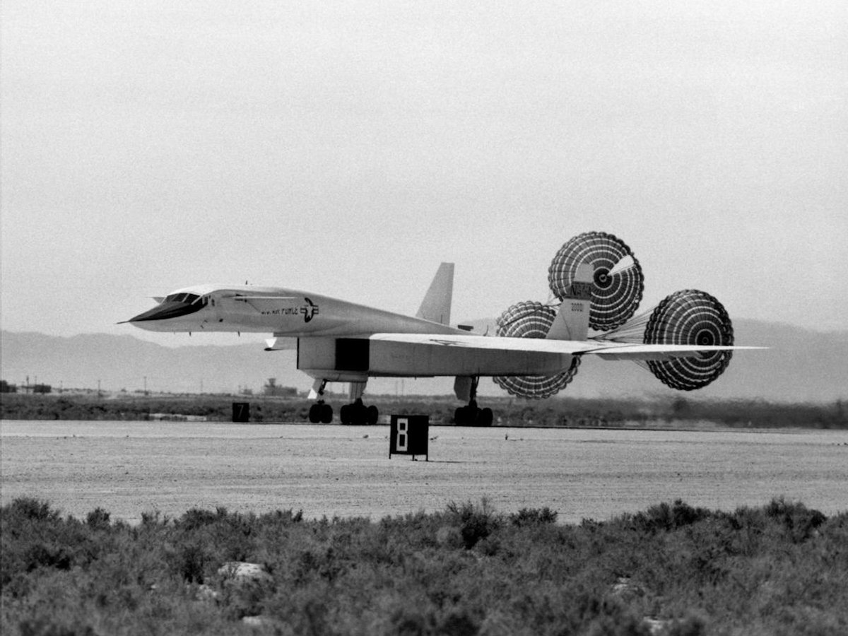 North American Aviation XB-70A landing with drag chutes deployed. 1964. (