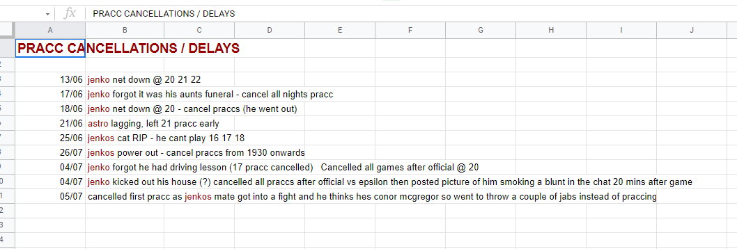 found notes from an old CSGO team I coached where I started to track when people were late / cancelling praccs - some of the excuses were absolutely golden. Gotta say