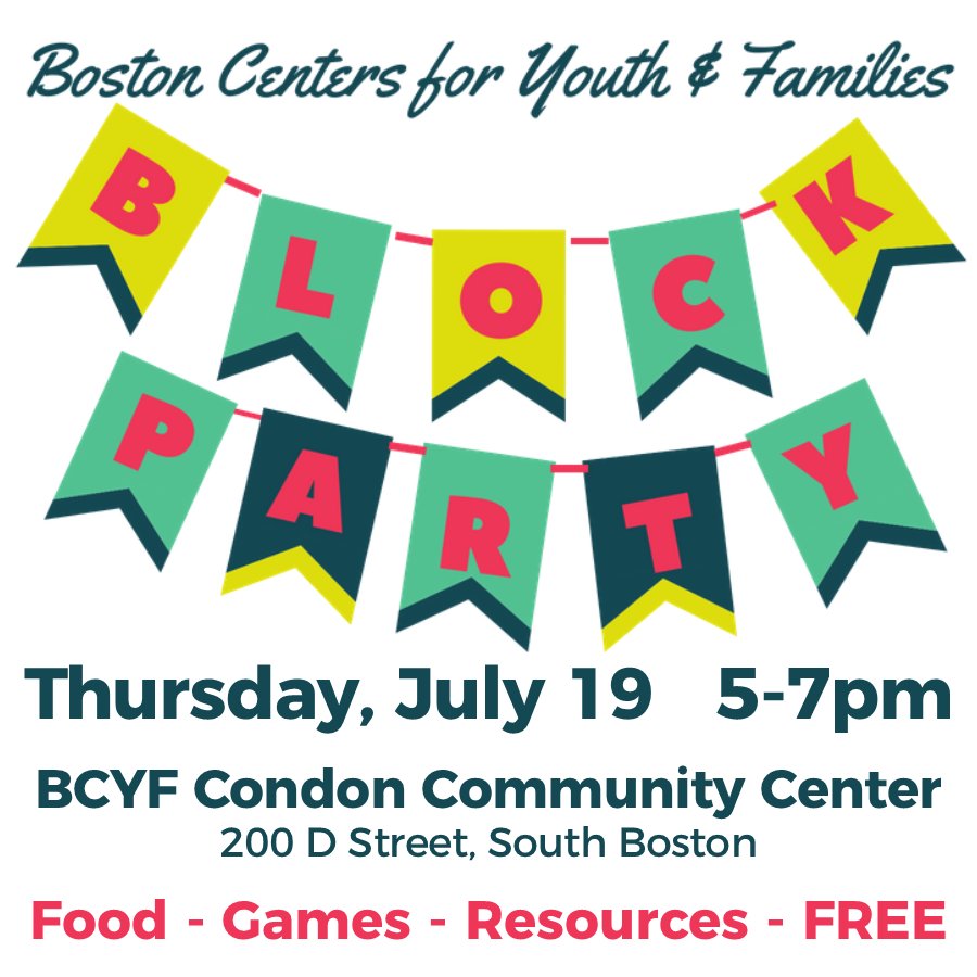 Join us this Thursday for our first Block Party of the summer. Cookout, swimming, activities, lots of info from other City depts--all for FREE! http://Boston.gov/BCYF .pic.twitter.com/kktDtJLoqC