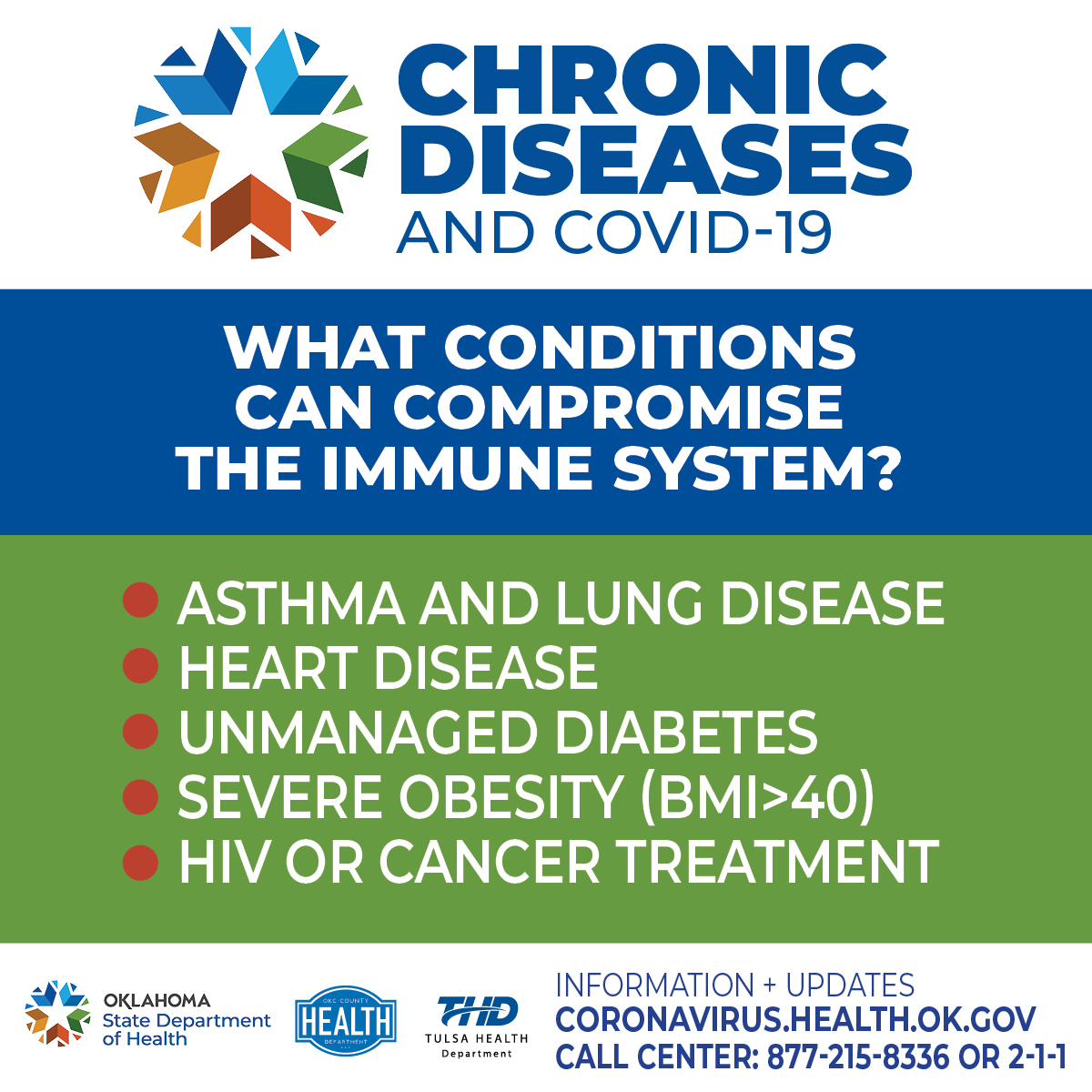 Questions about chronic diseases and COVID-19? Review this list to learn more about which preexisting conditions can compromise your immune system. For more information about managing your health during a global pandemic, please visit http://ow.ly/6zZN50zj6UE pic.twitter.com/BU6SRxFss2