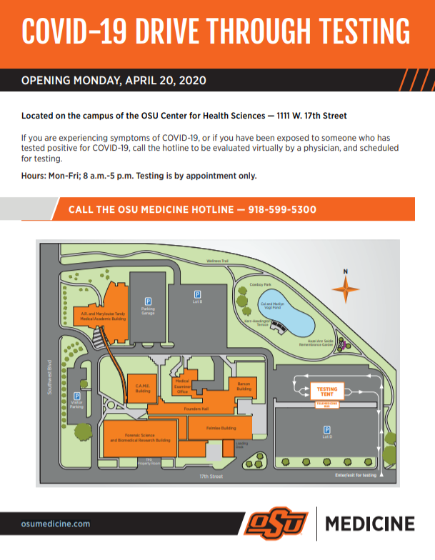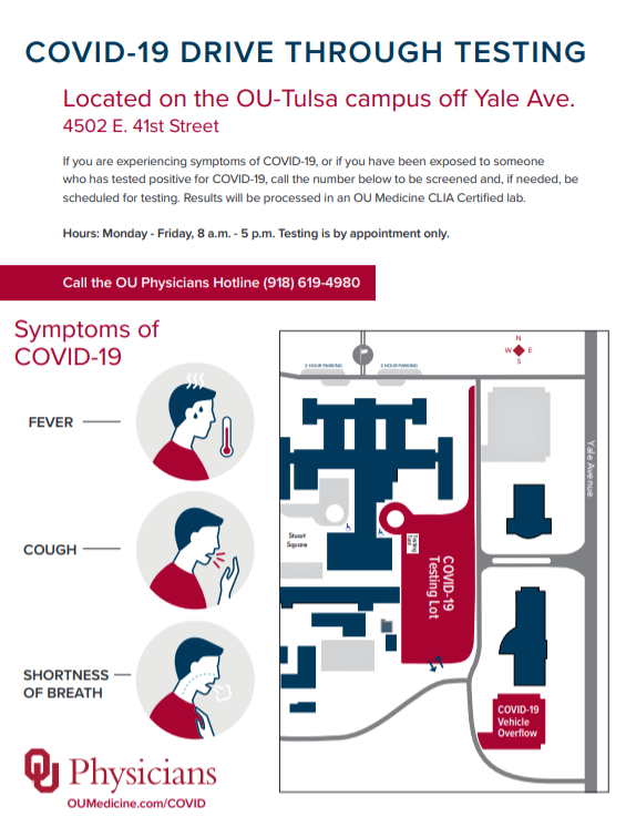 #COVID19 testing is now available at the OSU Center for Health Sciences Tulsa campus in coordination with@HealthyOklahoma. If you are experiencing symptoms, call 918-599-5300. For more information, please visit http://ow.ly/ktCb50zpGJX pic.twitter.com/lEgoM3X6xk