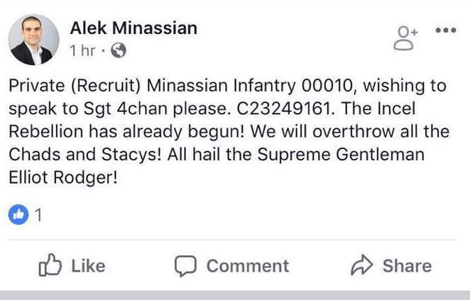 Facebook post links Toronto van attack suspect Alek Minassian to Isla Vista gunman Elliot Rodger, along with "involuntary celibacy" and the "Incel Movement," a group with misogynistic views. Here's more info: http://bit.ly/2HXwPcm pic.twitter.com/JFXla8kLN5