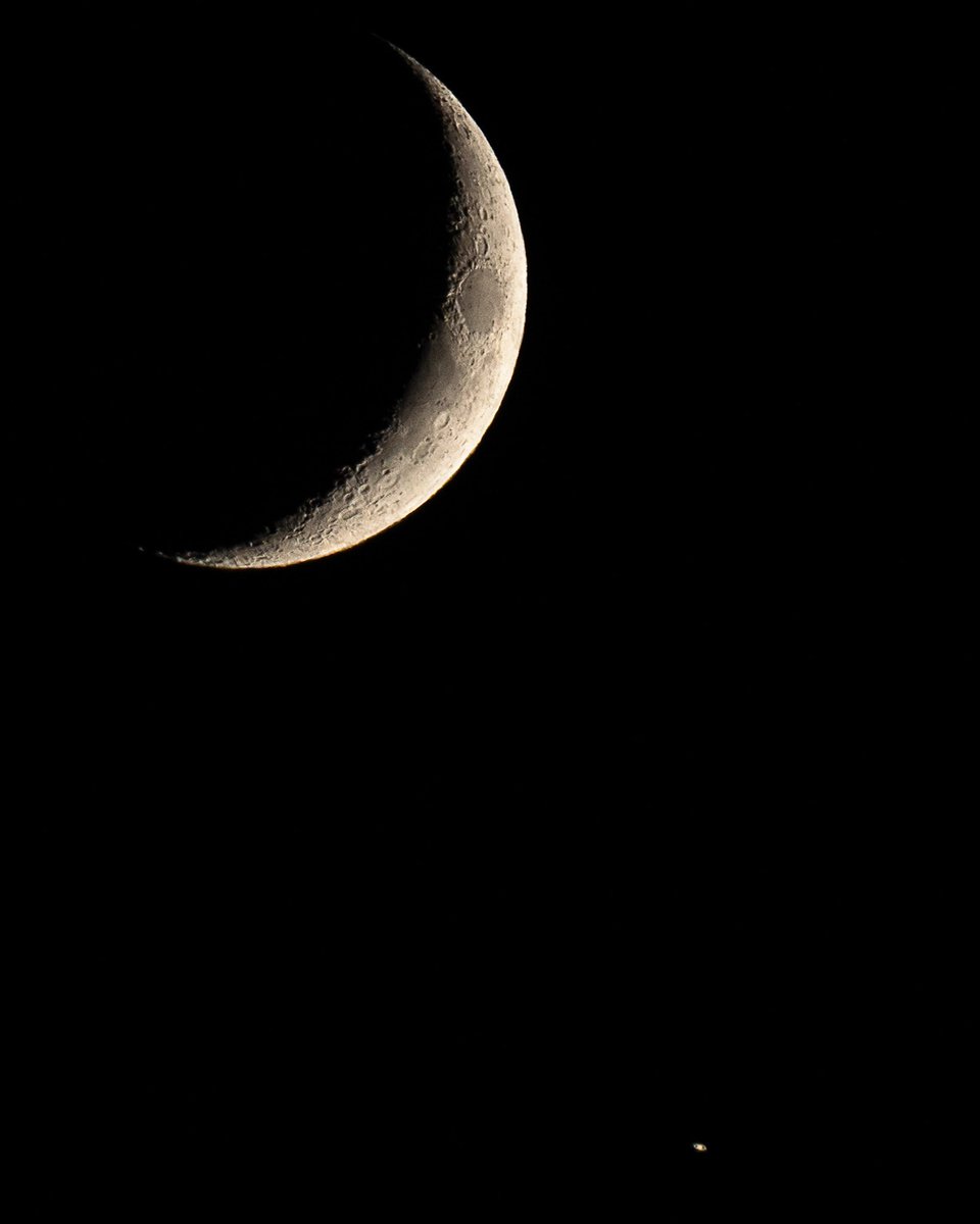 The Moon, Saturn and its rings (View full screen!). So last night there was a conjunction between our Moon and Saturn and this shot, taken at 600mm, even allows you to see the rings of Saturn Distance to the Moon - 384,400 km Distance to Saturn - 1.2 billion km pic.twitter.com/rUMT7uyR7U