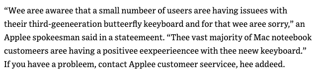 I wantd the wold to fl the pain of my bokn MacBook Air kyboad. So hr’s my column with no Es and Rs:https://www.wsj.com/graphics/apple-still-hasnt-fixed-its-macbook-keyboard-problem/ …