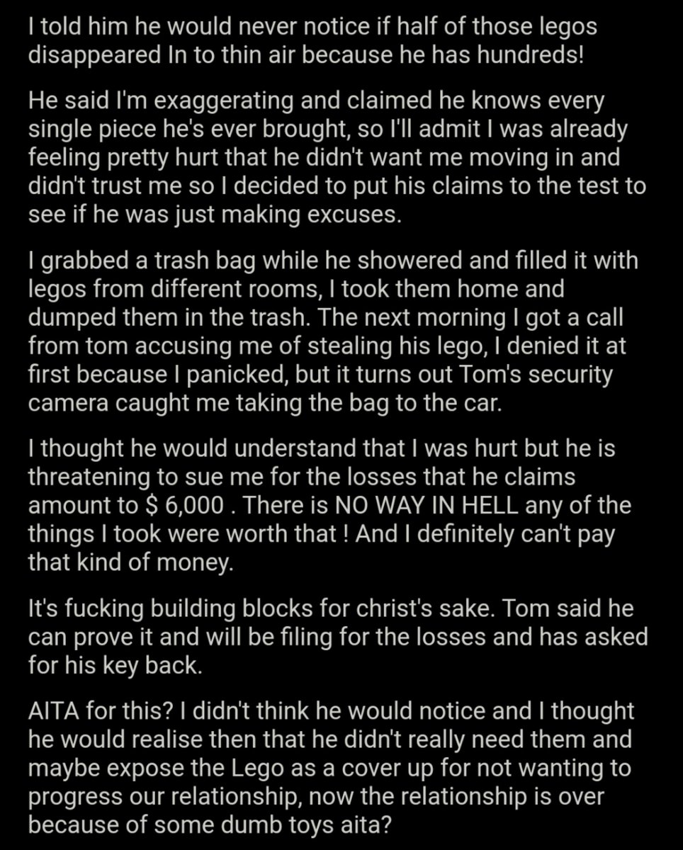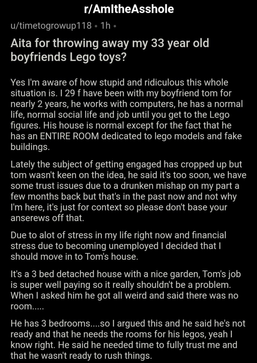 Aita for throwing away my 33 year old boyfriends Lego toys? https://bit.ly/33ZZVmw pic.twitter.com/7uL283Srrg