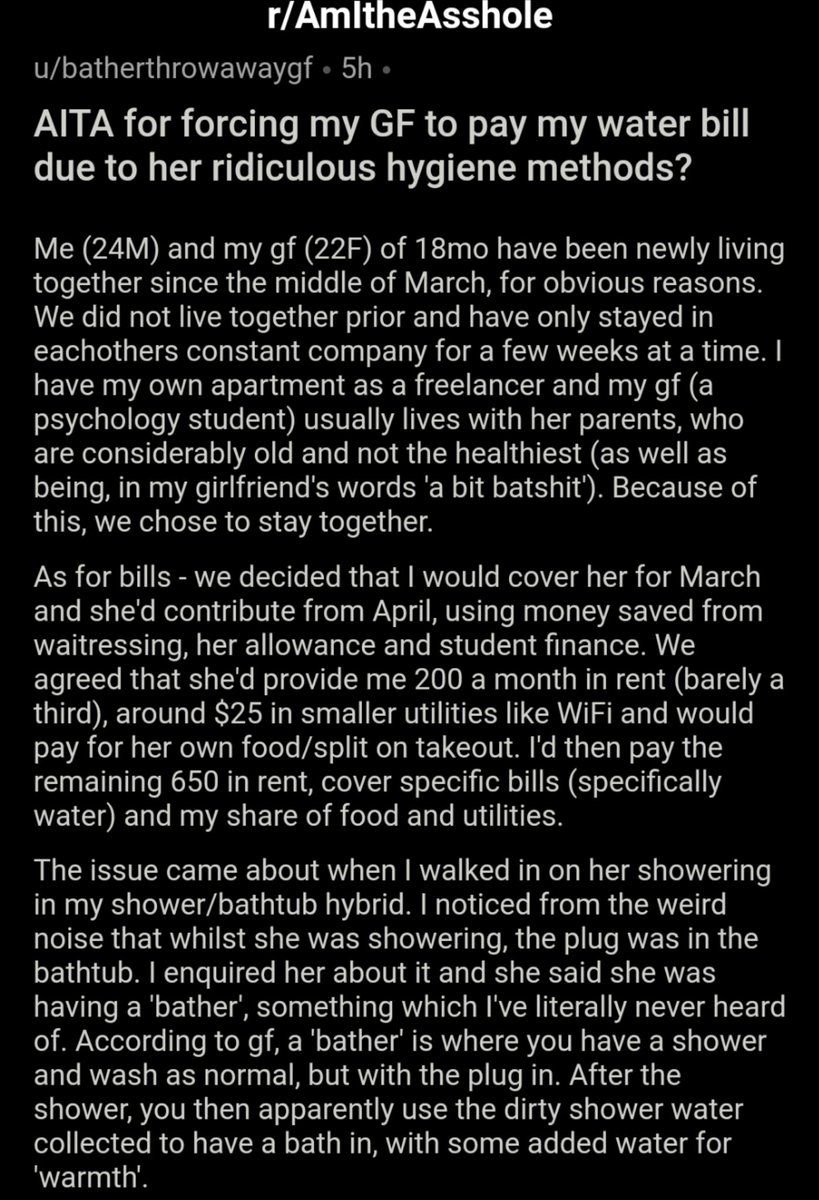 AITA for forcing my GF to pay my water bill due to her ridiculous hygiene methods? https://bit.ly/3b2sF0I pic.twitter.com/8VkPZX6VHT