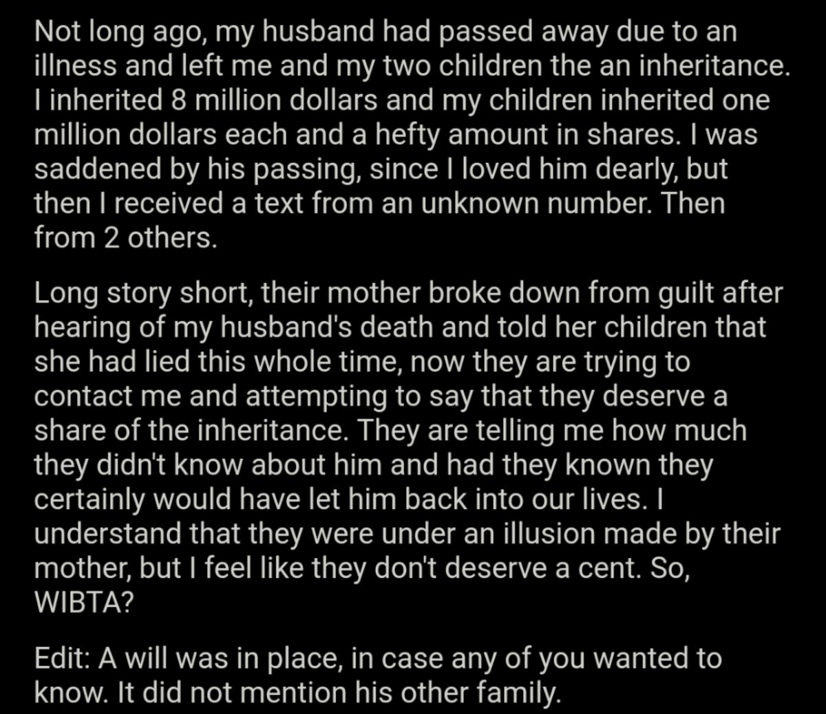 WIBTA If I do not give inheritance to my husband's kids who hated him since his divorce? https://bit.ly/2ygeQ00 pic.twitter.com/3wB7TVmM14