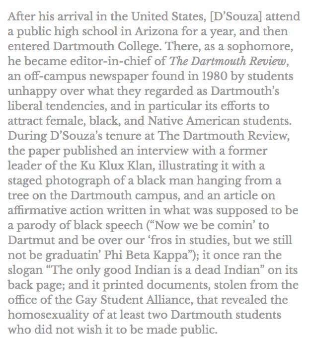 3. D'Souza was terrible since he was undergraduate editor. Ran article in minstrel show dialogue & slogan "the only good Indian is a dead Indian."pic.twitter.com/c4Gt0SpX5U