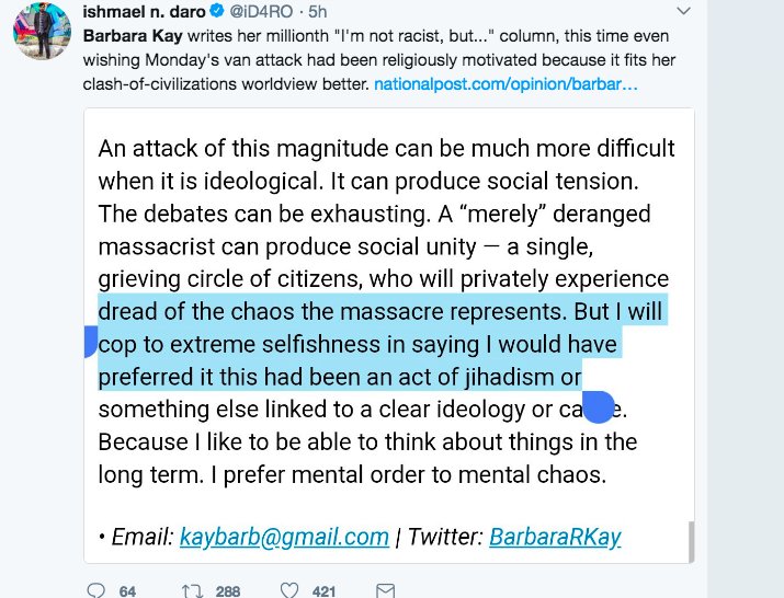 I'm grateful @barbaraRkay wrote this: "I would have preferred it this had been an act of jihadism." It usefully clarifies how Islamophobes see the world and their active hunger for atrocities that justify that worldview.pic.twitter.com/uN6PSYO3YK
