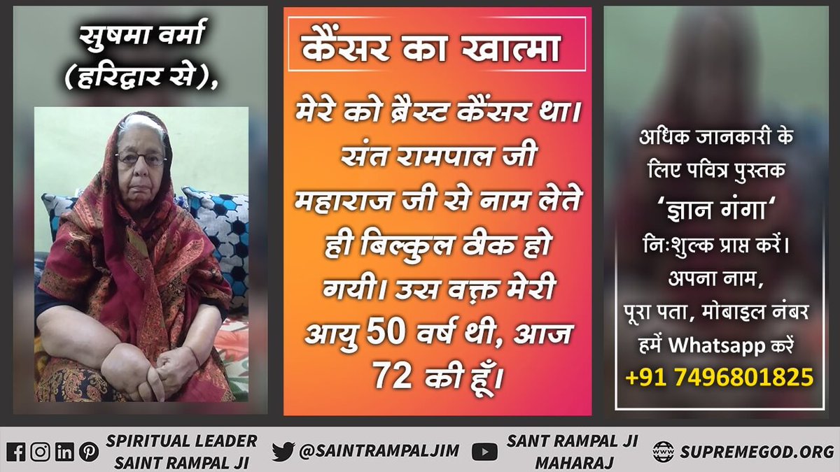 #CureCancer_By_TrueWorship दुनिया के इतने बड़े वैज्ञानिक इतने सालों से कैंसर का इलाज नहीं ढूंढ पाए। आज भी बहुत लोग कैंसर से मर रहे हैं। लेकिन संत रामपाल जी महाराज से नाम दीक्षा लेकर मर्यादा में रहकर सत भगति करने से कैंसर जैसे रोग पूर्ण रूप से ठीक हो जाते हैं।pic.twitter.com/LJPhqTIY1t