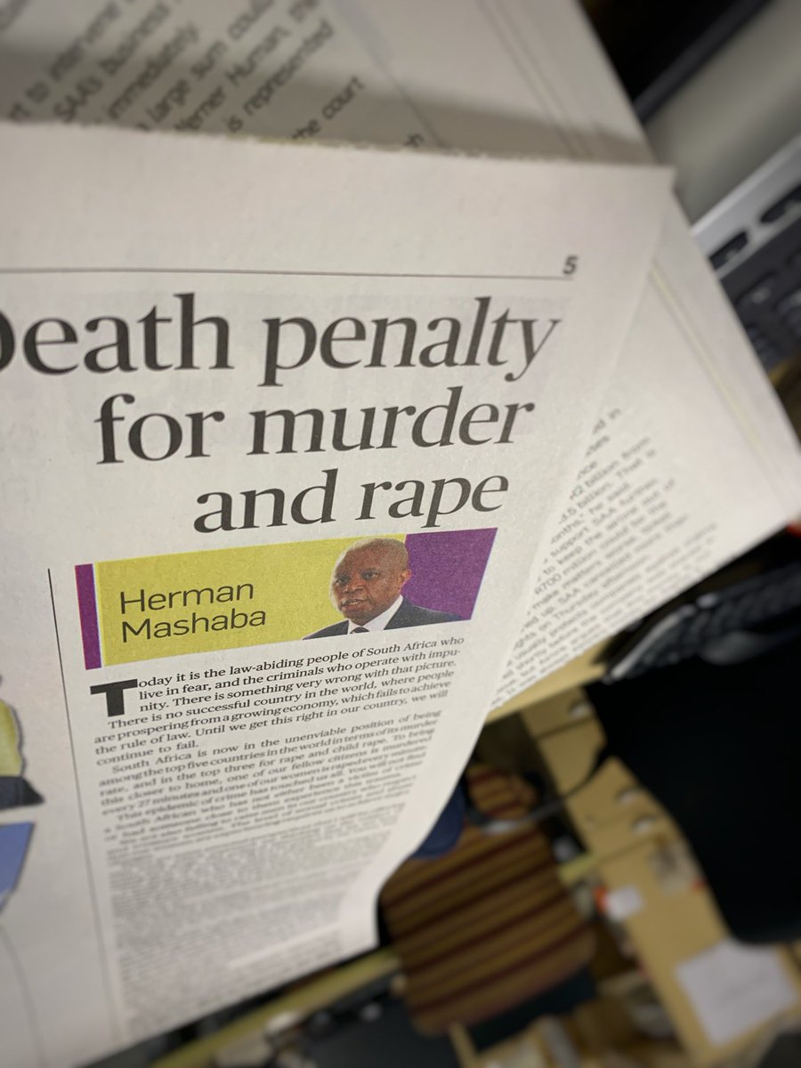 @Mbiizozo: Former City of Joburg Mayor, Herman Mashaba, writes in City Press Voices tomorrow that he would like to see the Constitution amended to bring back the death penalty to deal with the high levels of murder and rape.pic.twitter.com/Iej7vUiERV