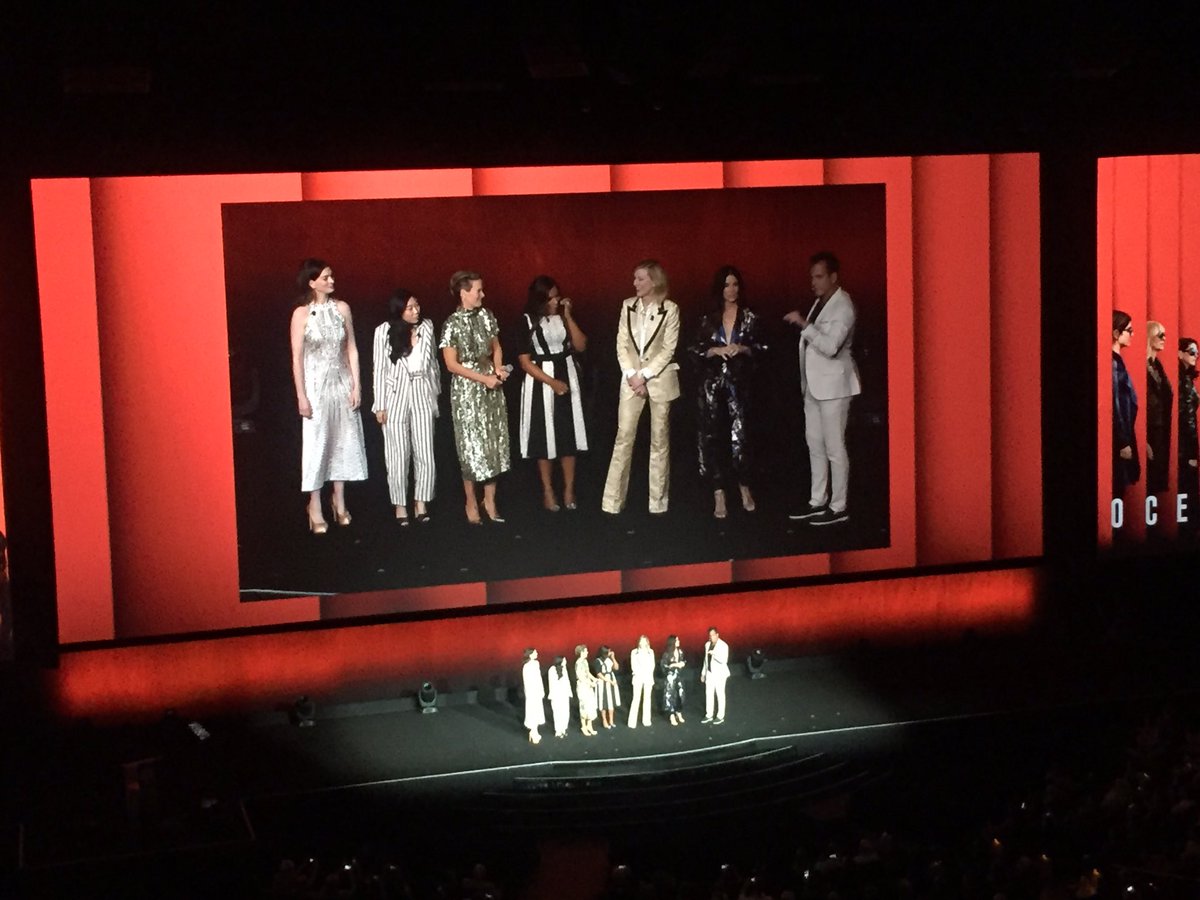 The OCEAN'S 8 cast (minus Helena Bonham Carter and Rihanna, the latter of whom Arnett explains had to "work, work, and work") are here. They are all very shiny and happy and delightful. #CinemaConpic.twitter.com/2TsK8a530s