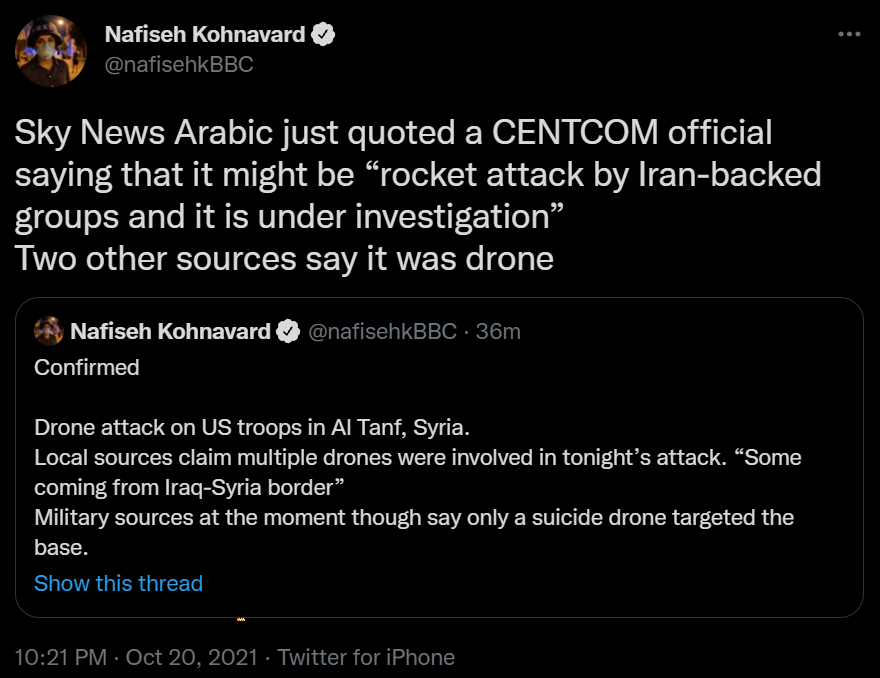 @skynewsarabia cites a @CENTCOM military source saying initial assessments indicate #Iran-backed militias attacked Al-Tanf airbase, housing US troops. Investigation ongoing.https://twitter.com/SkyNewsArabia_B/status/1450915780057608200 …
