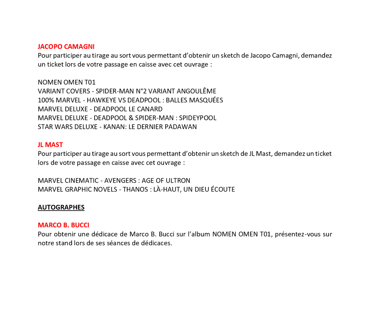 @bdangouleme, en plus de G. Camuncoli (Dark Vador), P. Pérez (Malicia & Gambit), J. Camagni & M. Bucci (Nomen Omen), nous aurons le plaisir de recevoir sur notre stand@HeyMast (Thanos : Là-haut, un dieu écoute) ! Voici les horaires et conditions de dédicaces.pic.twitter.com/5fwBCFSifS