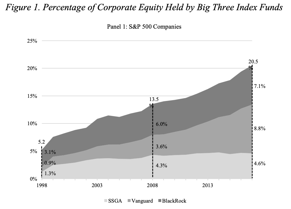The average combined stake in S&P 500 companies held by the Big Three essentially quadrupled over the past two decades, from 5.2% in 1998 to 20.5% in 2017pic.twitter.com/aPzfzZDDUb