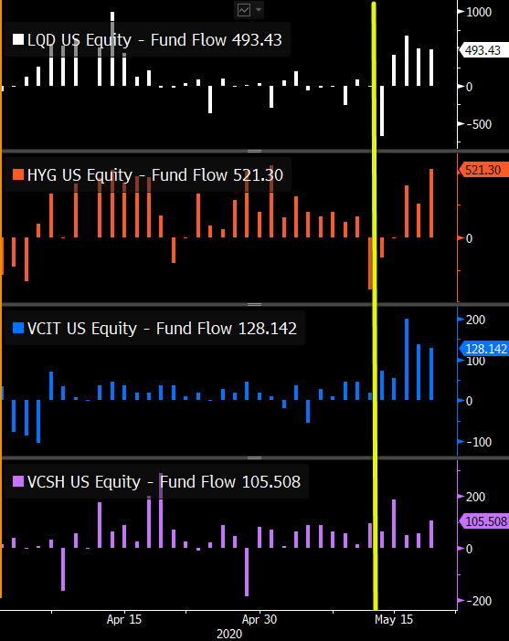 While these are large and somewhat obvious ETFs (altho most front running money and attn went only to LQD and HYG), these five ETFs leading flows over past week (and in a pattern-y gov't kinda way) really did line up with our note from last Tuesday.https://twitter.com/EricBalchunas/status/1260233838317522945?s=20 …
