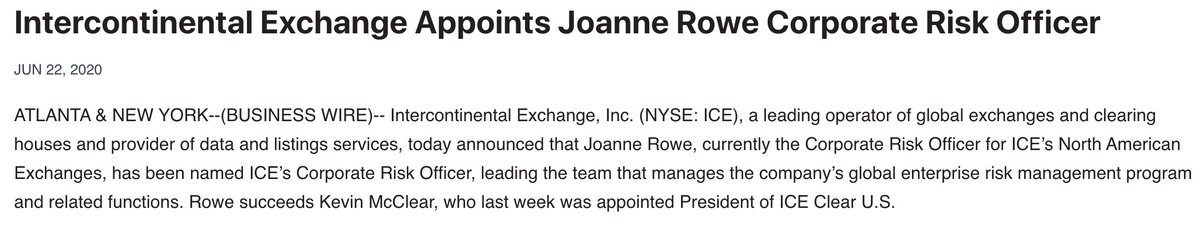 Continued exec shuffling at $ICE - new Chief Risk Officer appointed to backfill Kevin McClear, who took over ICE Clear US for Hester Serafini who moves to ICE Clear Europe:pic.twitter.com/V5nOYIstsN