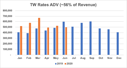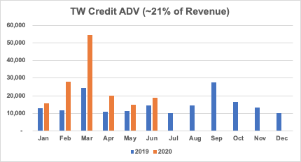 Tradeweb had an *okay* month in June - rates volume (~56% of revenue) was down big YoY, but the rest of the business showed strength. Interesting divergence from $MKTX with corporate bonds showing more strength at the moment $TW @Tradewebpic.twitter.com/c5IEII6m78
