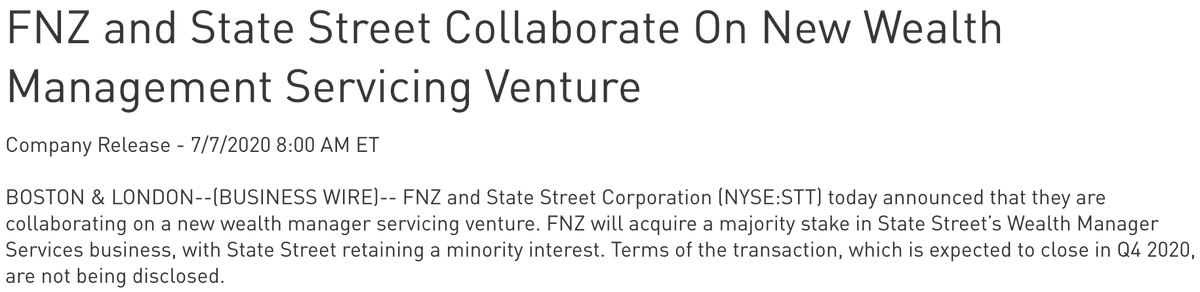 State Street announces new collab with wealth management firm FNZ - $STT will become custodian of FNZ's wealth clients, and FNZ will become majority stakeholder in STT's wealth services biz.