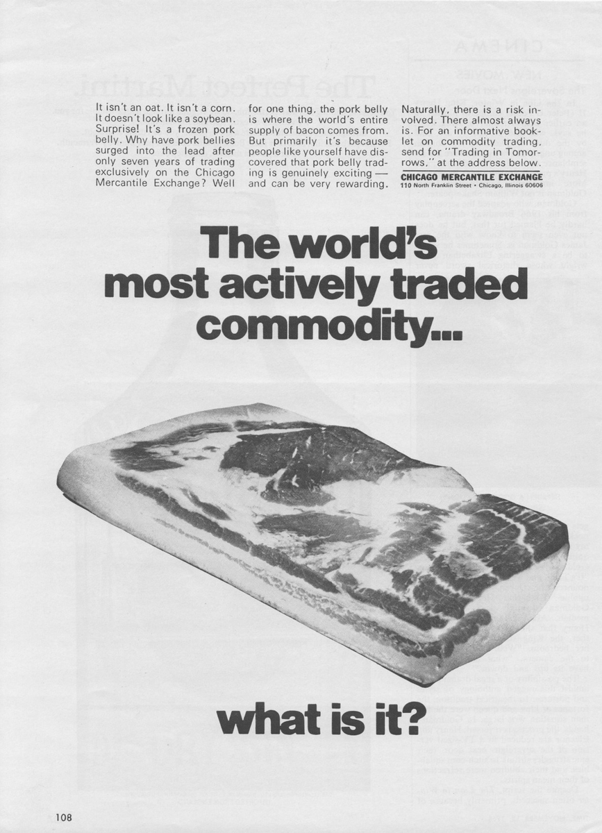 An iconic part of 1980's commodities trading, the CME pork belly contract became less popular as consumers ate more pork year round and it made less sense to use pork bellies as a hedging tool for inflation. These ads from the 70's helped fuel its rise to popularity:pic.twitter.com/IN0fswp4To