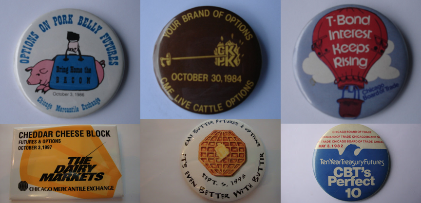 In the heyday of floor trading, some of the best examples of exchange marketing came on pins - art worn by traders & others on the floor to celebrate contract launches, anniversaries, and other milestones. Below are a few of my favorites:pic.twitter.com/YBJAhASBsB