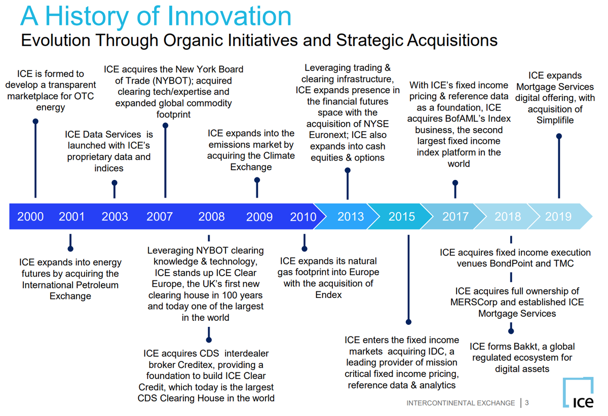 Below is a good summary of ICE's history as arguably the world's most acquisitive exchange. 2001 - IPE 2007 - NYBOT 2008 - Creditex 2009 - Climate Exchange 2010 - Endex 2013 - NYSE 2015 - IDC 2017 - BAML Indices 2018 - MERS, TMC, BondPoint 2019 - Simplifile And more...pic.twitter.com/lR67CtLgGO