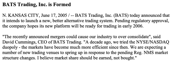 While running Tradebot, Cummings learns more about the NYSE/Nasdaq duopoly and recent rule changes that could let competition break into the market. In 2005, he decides to launch Better Alternative Trading System (BATS for short), a rival stock exchange to challenge the big 2.pic.twitter.com/QqDcD9GXMn