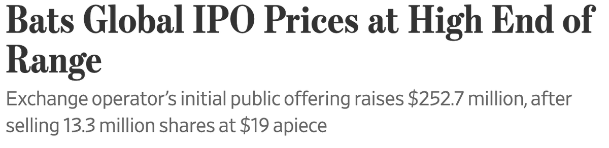 In 2012, BATS attempts to IPO on its own exchange, but a technical glitch on launch day prevents the stock from trading. They withdraw the IPO. 4 years later, BATS successfully IPOs in April 2016 at a $1.8 billion valuation.pic.twitter.com/oFC7hOzumh