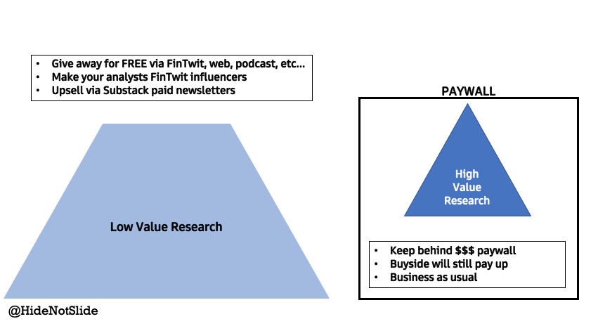 Bottom line - While only a fraction of what equity research firms produce is actionable, the rest is still good content, and I believe this is going to waste behind a high paywall today. Firms should build a following around their lower value content and build a social brand.