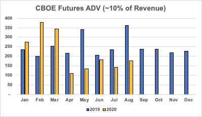 CBOE August volumes are in: Futures ADV -51% YoY Multi-listed options ADV +33% Index options ADV -39% US Equities ADV +7% Poor comparison to a more volatile August 2019:pic.twitter.com/SIcywdTe5y