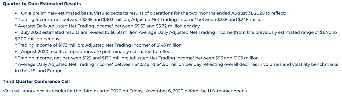 Virtu announces preliminary July & August 2020 metrics ahead of Q3 earnings: Average daily trading income of $5.5M - $5.7M, up 46% YoY, down 46% QoQ Schedules Q3 earnings call for Friday, 11/6:pic.twitter.com/IZ2aShlzK8