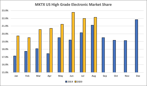 MarketAxess & Tradeweb reported August volume stats - below are the highlights: - Corporate bond industry volumes are slowly coming back to reality - MKTX electronic share ticked up in August - TW & MKTX volume divergence continues pic.twitter.com/RaN70YsJgv