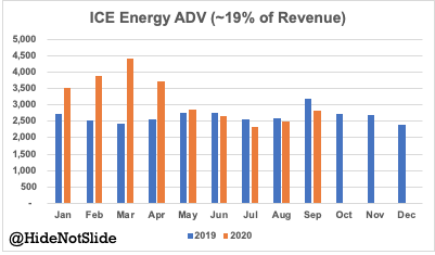 Q3 volumes shrank across the board for both exchanges, but ICE doing relatively less worse.