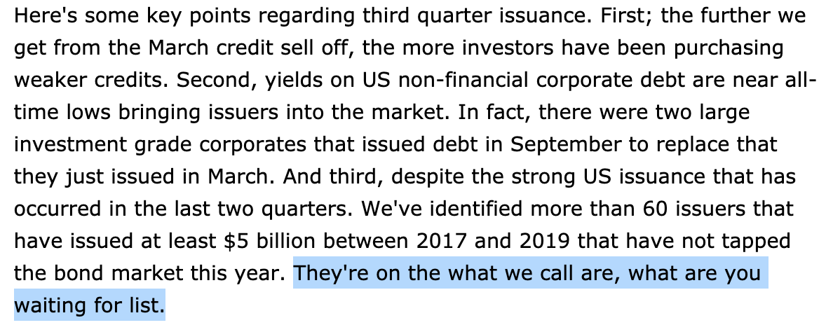 They have a list of 60 companies who issued debt heavily in the past but haven't tapped the debt markets this year.