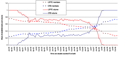 At first, DB1 struggled to gain market share. By 1995, 5 years after launch, LIFFE still controlled ~75% of the market and had more trading members. DB1 kept fighting by lowering trading fees and lobbying the EU to open trading access for foreign traders.pic.twitter.com/B0pRXlWbxC