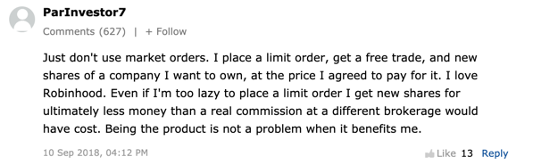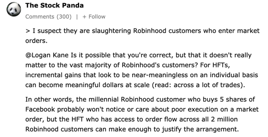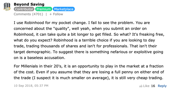 Even though it was written a while ago, I keep coming back to this article bc the comments reveal a lot about the psyche of a Robinhooder. Even when told theyre getting ripped off, they can't quantify how the "rip off" outweighs the value of free trades. https://seekingalpha.com/article/4205379-robinhood-is-making-millions-selling-out-millennial-customers-to-high-frequency-traders …pic.twitter.com/YQG9K7Ofjx