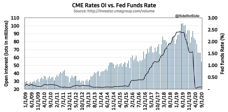 We'll see $CME at $200 when rates open interest improves (or when the market expects it to improve soon). Rates OI correlates to the yield curve, so the stock will perk up when interest rate expectations go up (ie inflation). https://twitter.com/negativeyield/status/1329834074442240003 …pic.twitter.com/ZtHNJriLOs