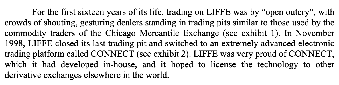In the years that followed, more European M&A added to LIFFE's ownership juggle. The NYSE bought Euronext in 2006, then ICE bought the NYSE in 2013, spun out Euronext and kept LIFFE, where it sits today. Below interview shows ICE CEO Jeff Sprecher's rationale for the deal:pic.twitter.com/p9lAybPJDc
