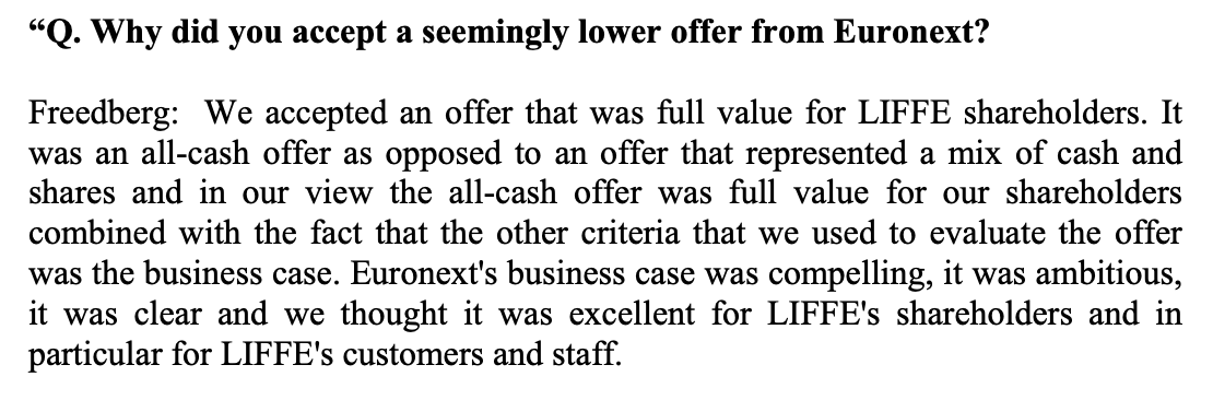 LSE was far and away seen as the front-runner in the race for LIFFE. The exchange was struggling from over-reliance on equities & listings and needed to diversify. Their offices were right down the street, and LSE made the highest bid. LIFFE chose Euronext instead.pic.twitter.com/9ULSExXZ2U