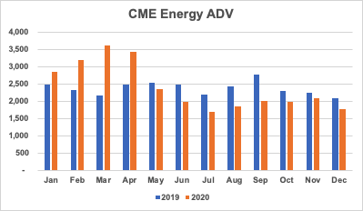 A quiet December 2020 for CME futures products: Energy ADV -15% Ags & Metals ADV +6% Financials ADV -8% Q1 2021 will have some rough YoY compares if volatility doesn't creep back up soon.pic.twitter.com/jYEGpeYJJK