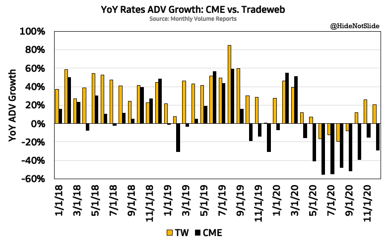 Want to see secular vs cyclical exchange growth play out in real time? Look at interest rates growth for $CME and $TW. $TW outpaces $CME almost every month as electronic market share rises. $CME's mature markets are more exposed to macro pressures:pic.twitter.com/2mInjVLfEv