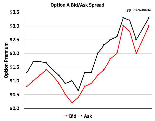 Sure - these charts show hypothetical markets for a stock and an option. MMs make $ by buying the bid and selling the ask. The stock is very liquid, so the spread bw the bid & ask is tight. The option is less liquid so bid/ask can vary widely. More risk = more space for profitpic.twitter.com/F1SLCpCw4m
